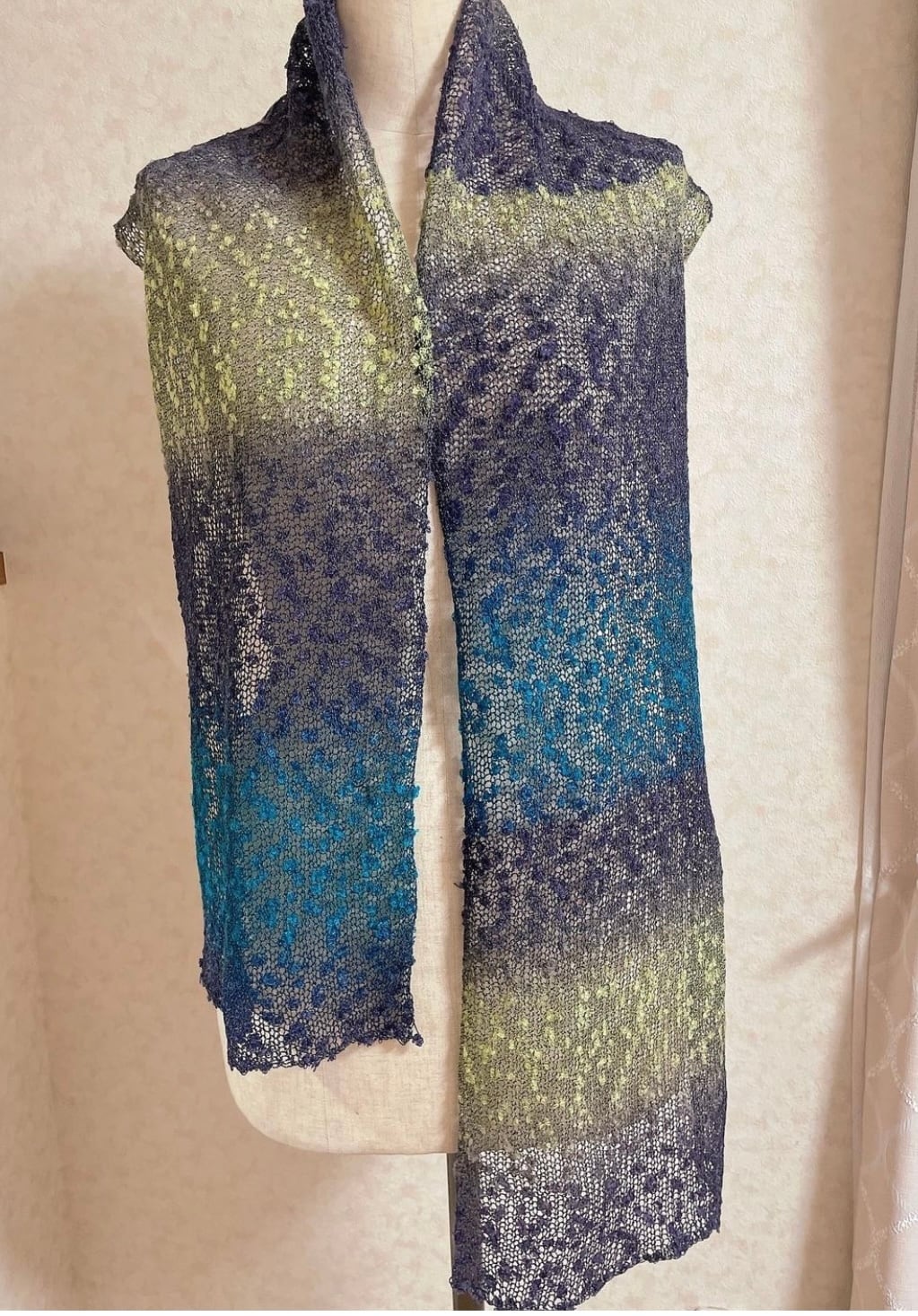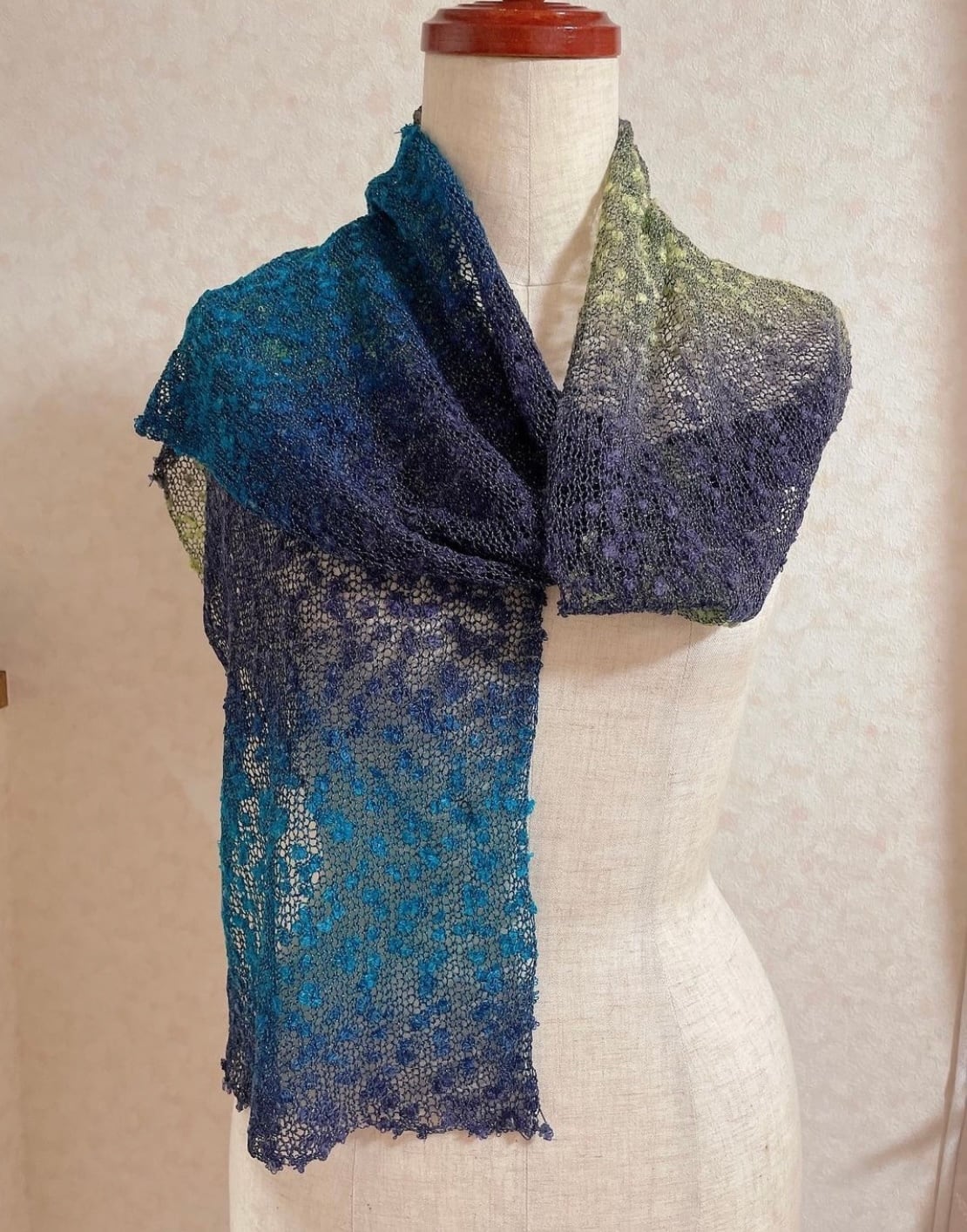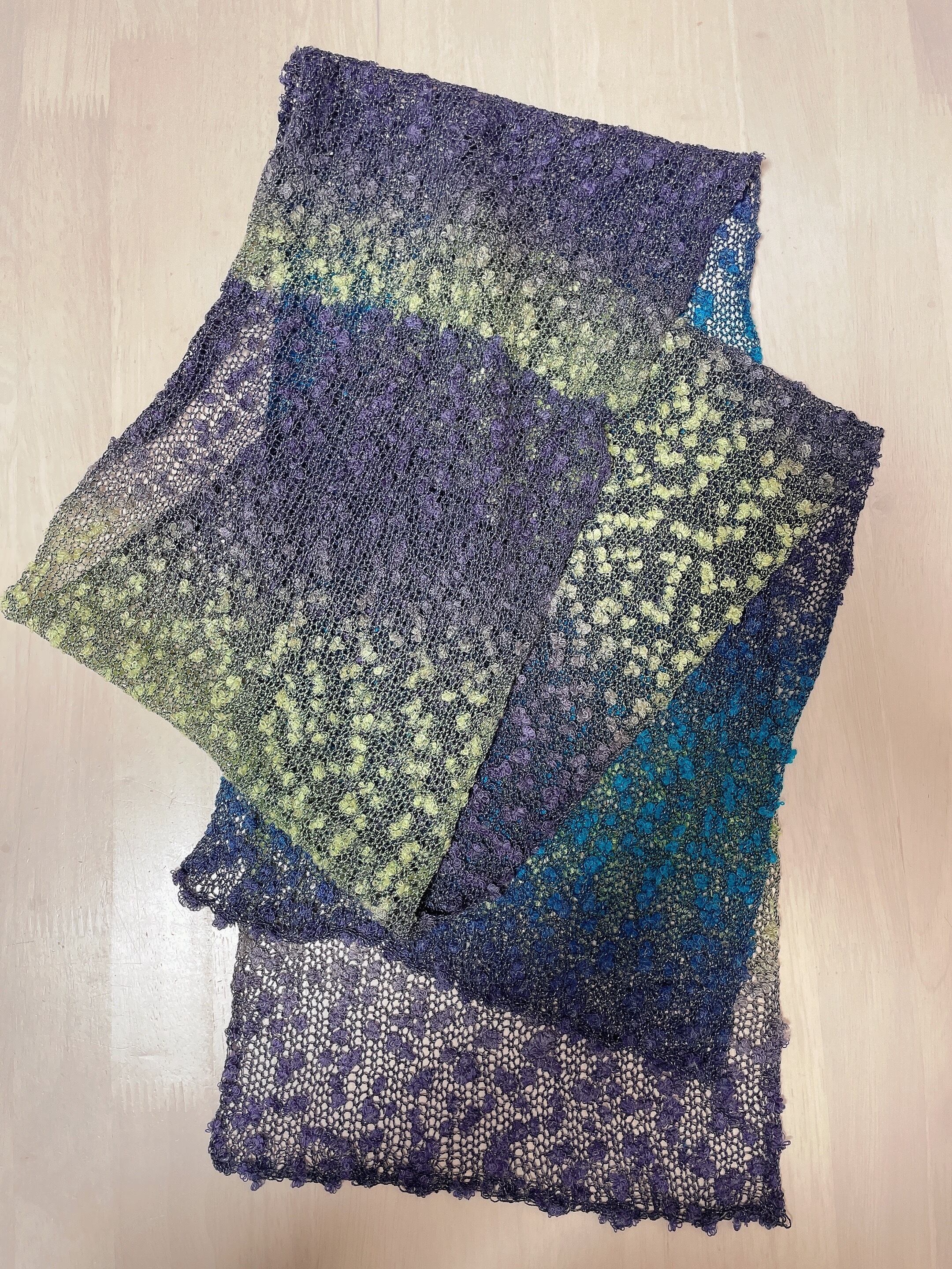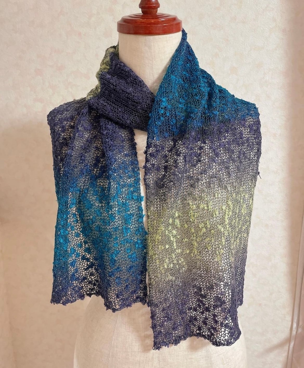 ネップがリボンのように見えるので、とても華やかな印象になるストールだと思います。