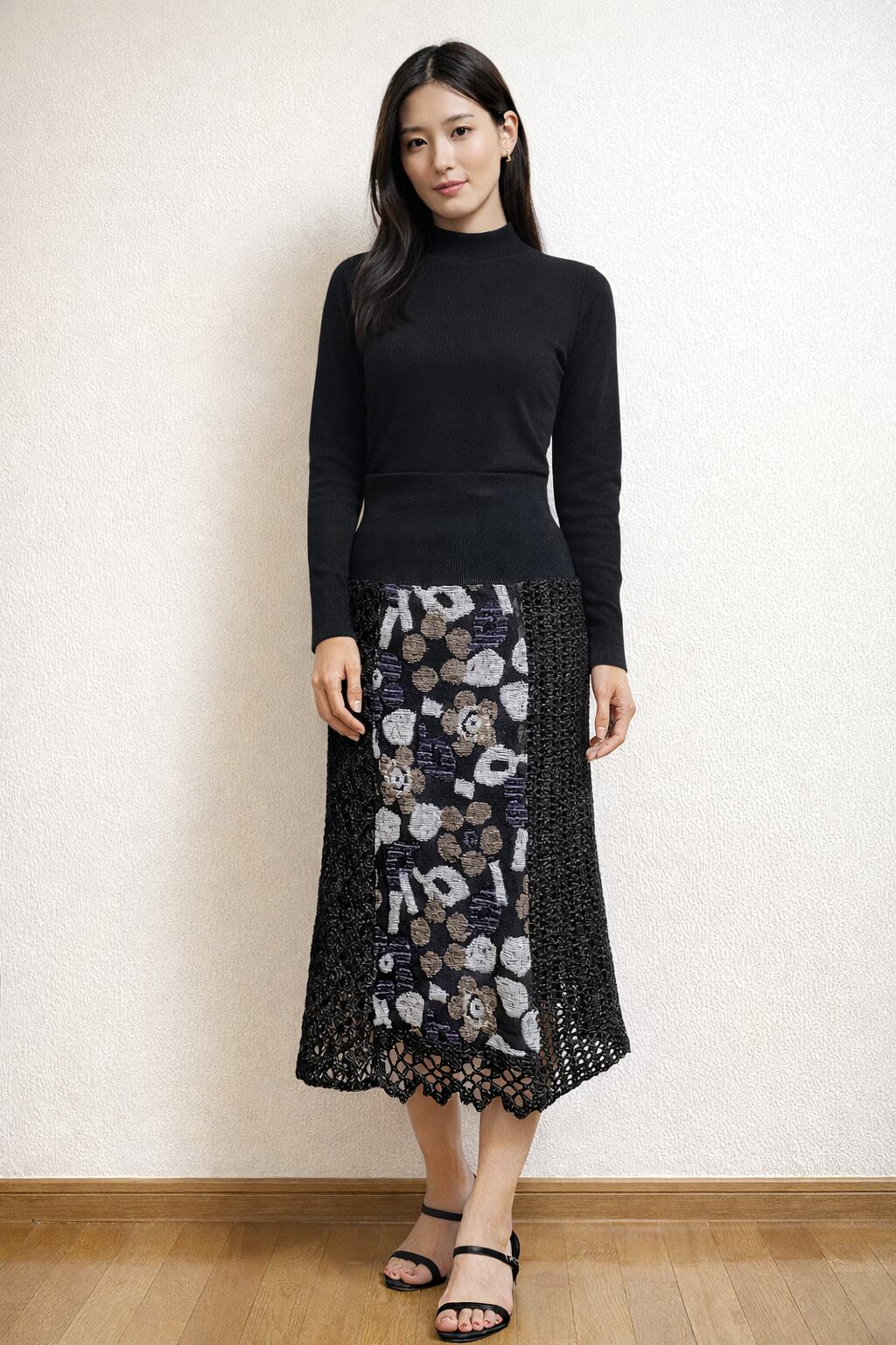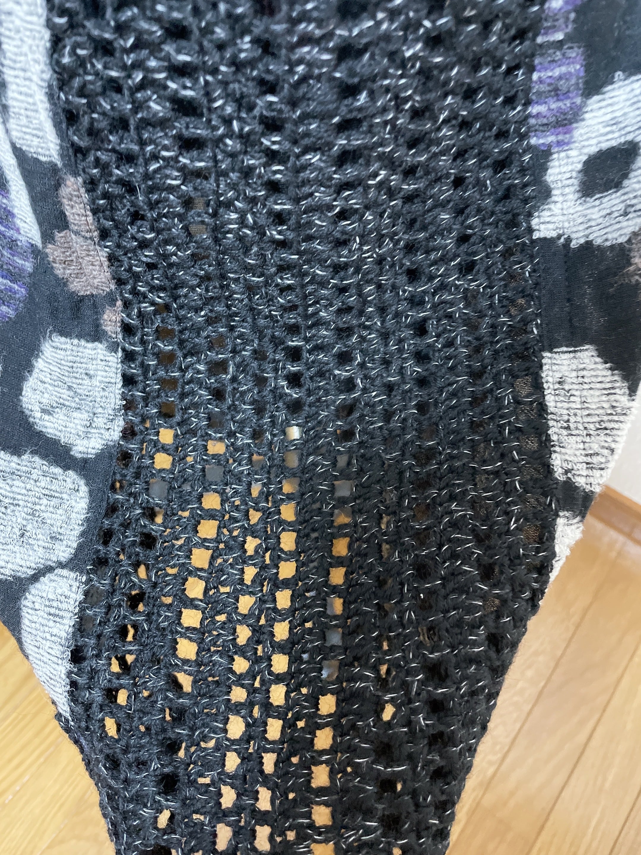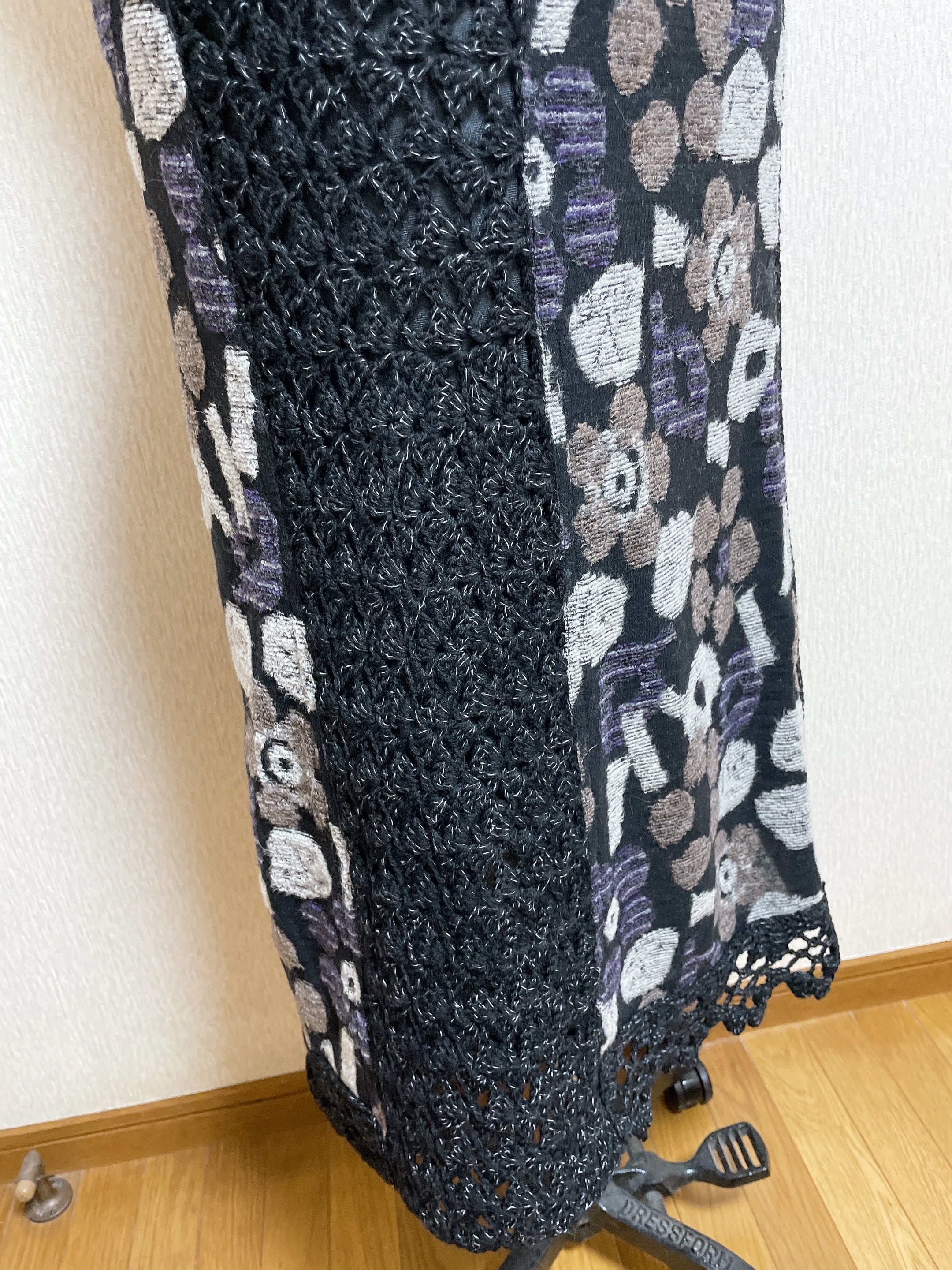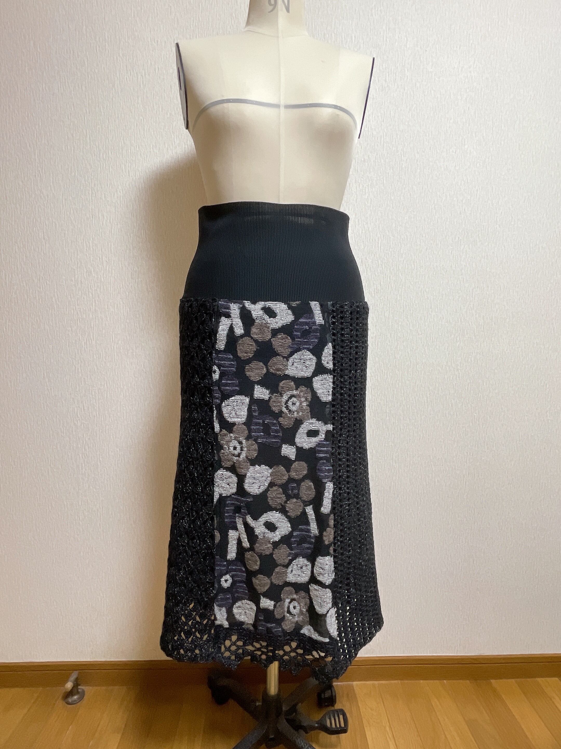 ニット生地と、かぎ針で編んだ編地を組み合わせて6枚はぎにしたスカートです。