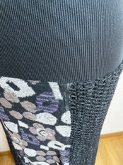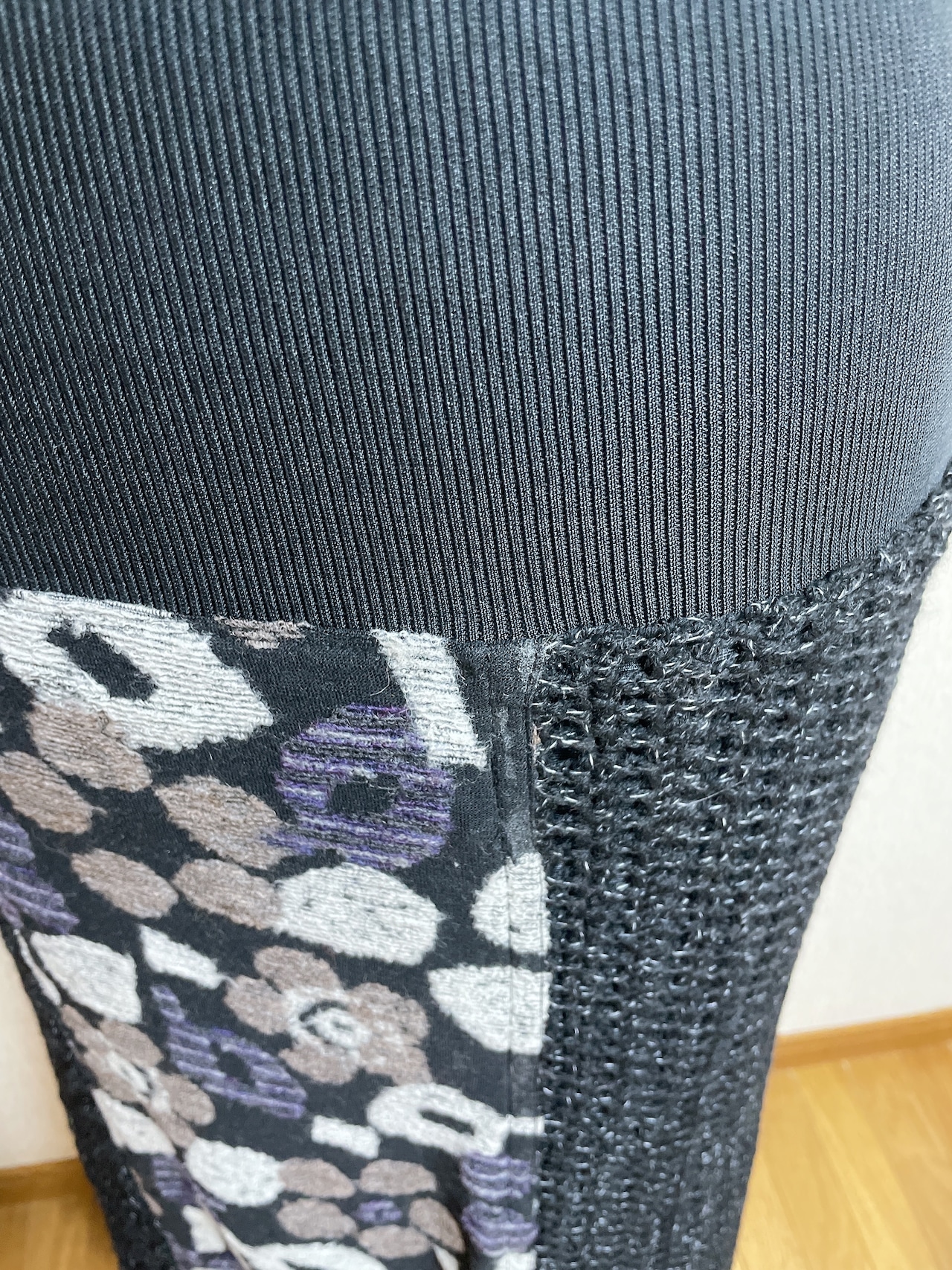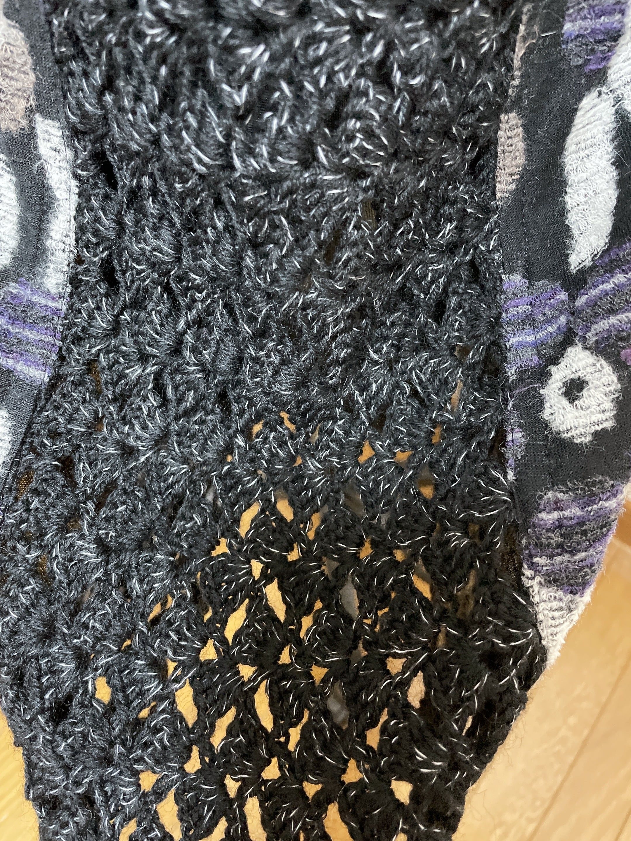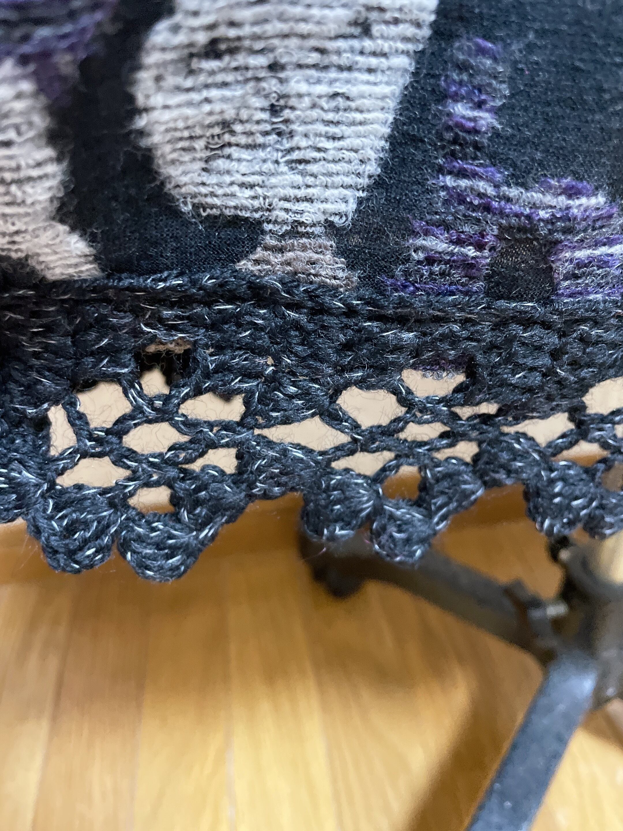 ニット生地と、かぎ針で編んだ編地を組み合わせて6枚はぎにしたスカートです。