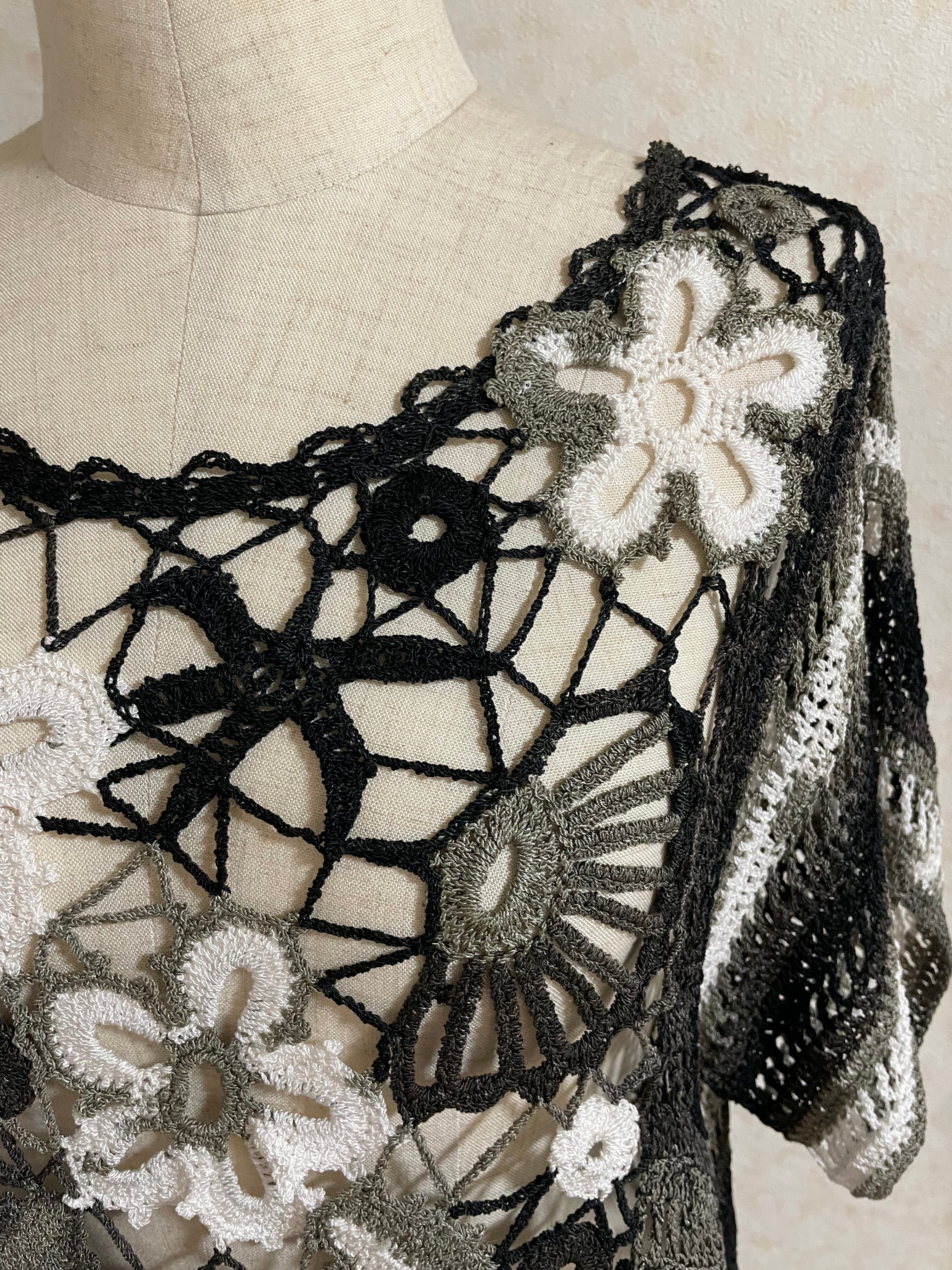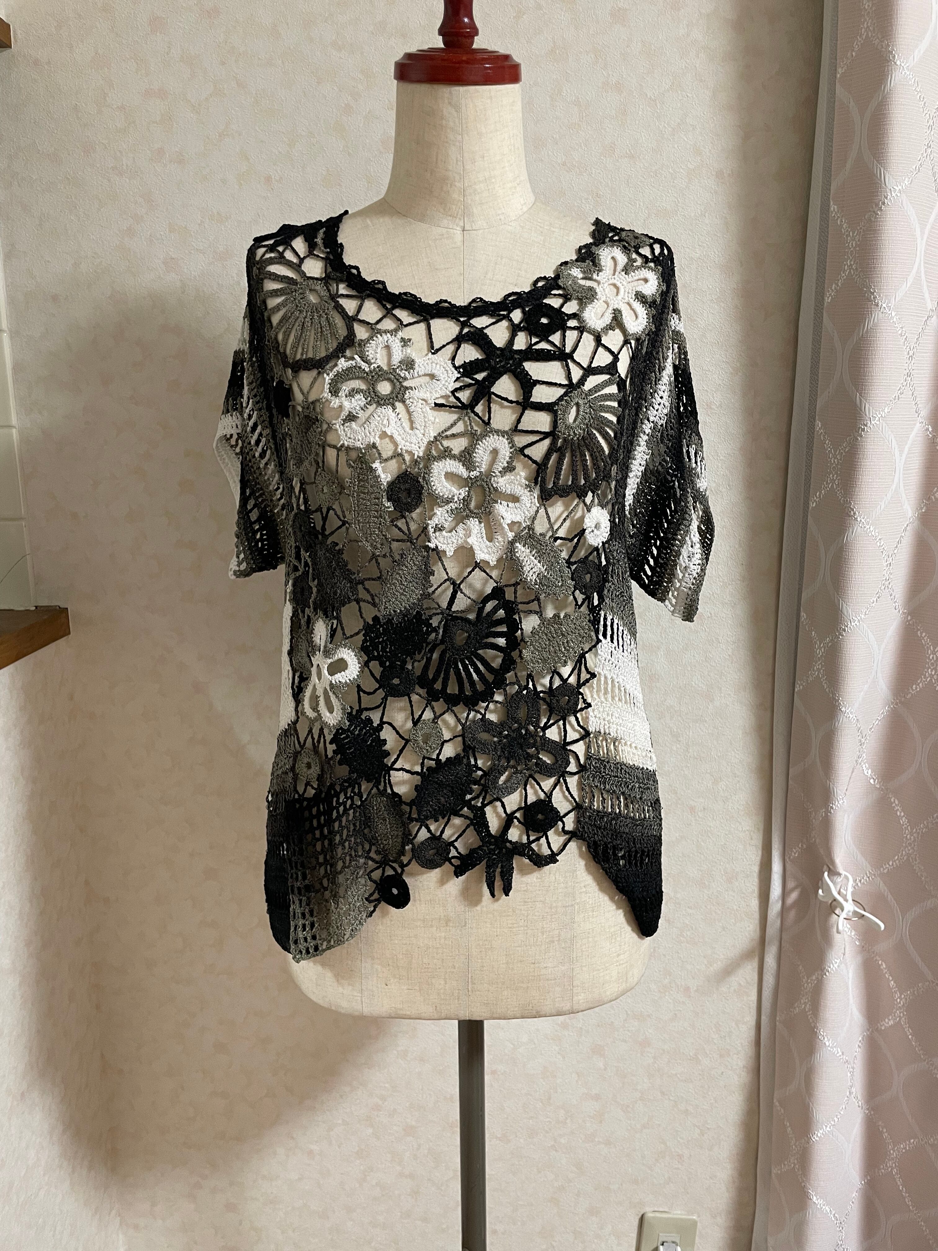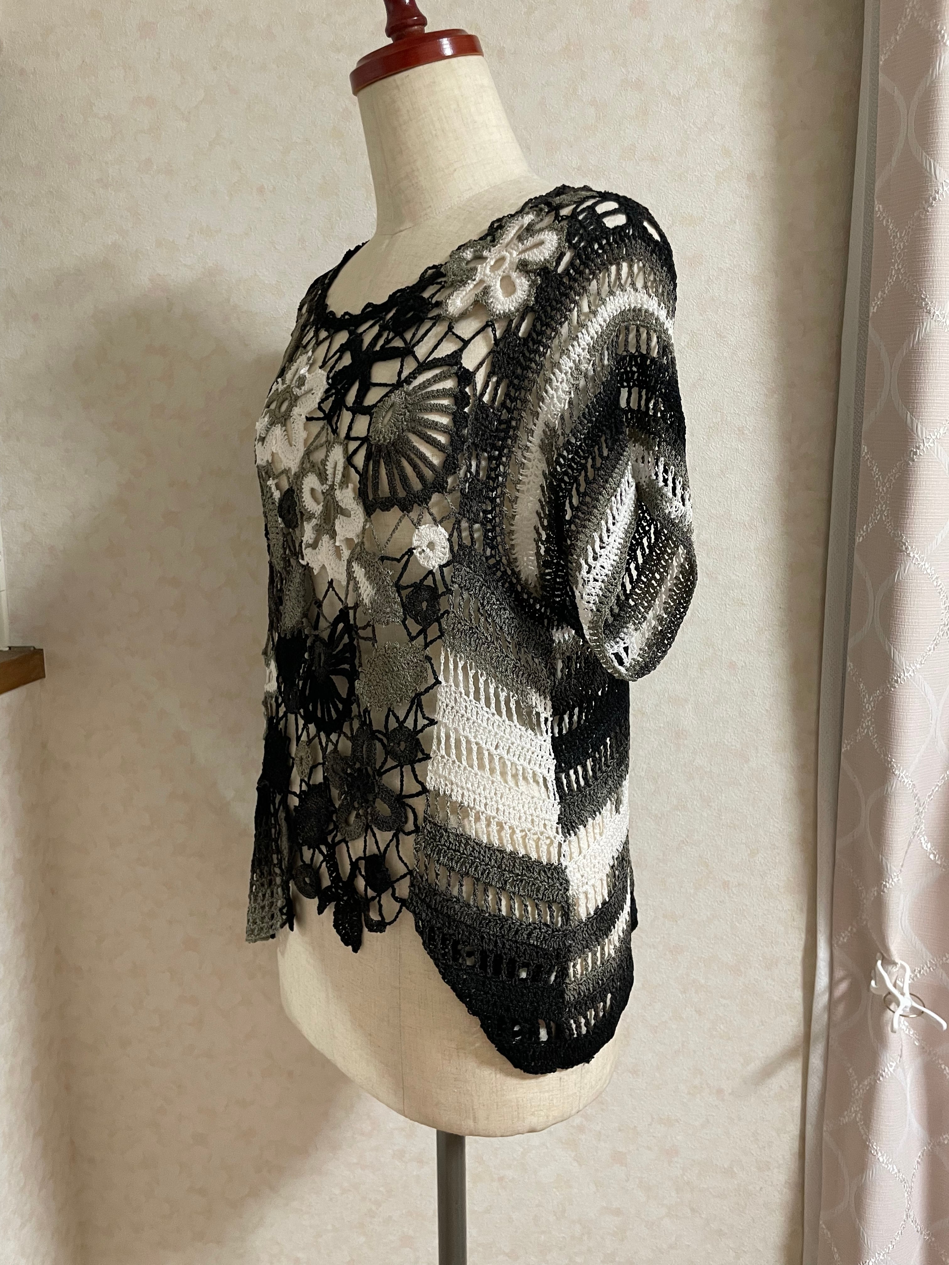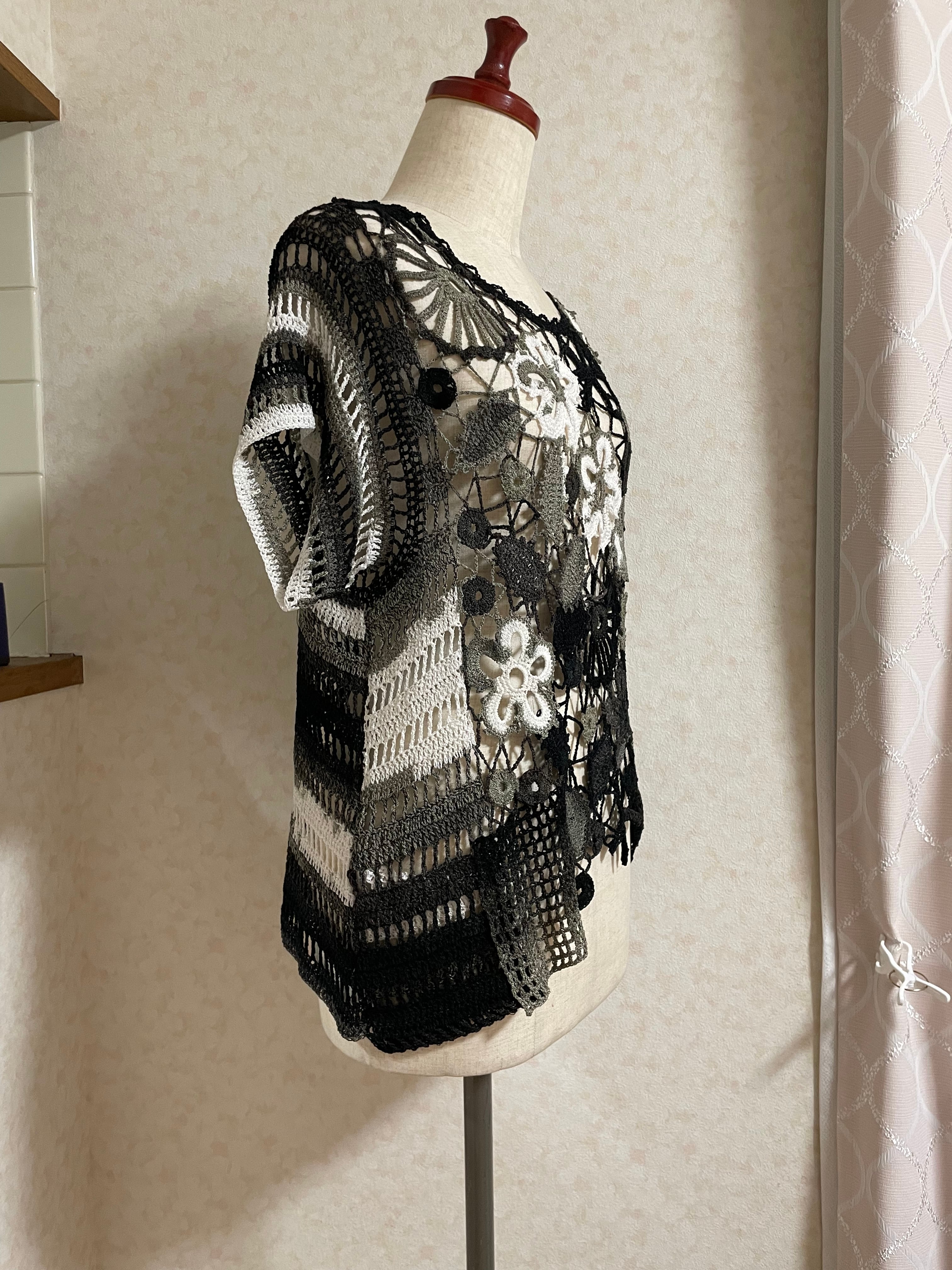 前身頃はモチーフ繋ぎ、後身頃はかぎ針の編地で出来た、とてもお洒落なベストです。