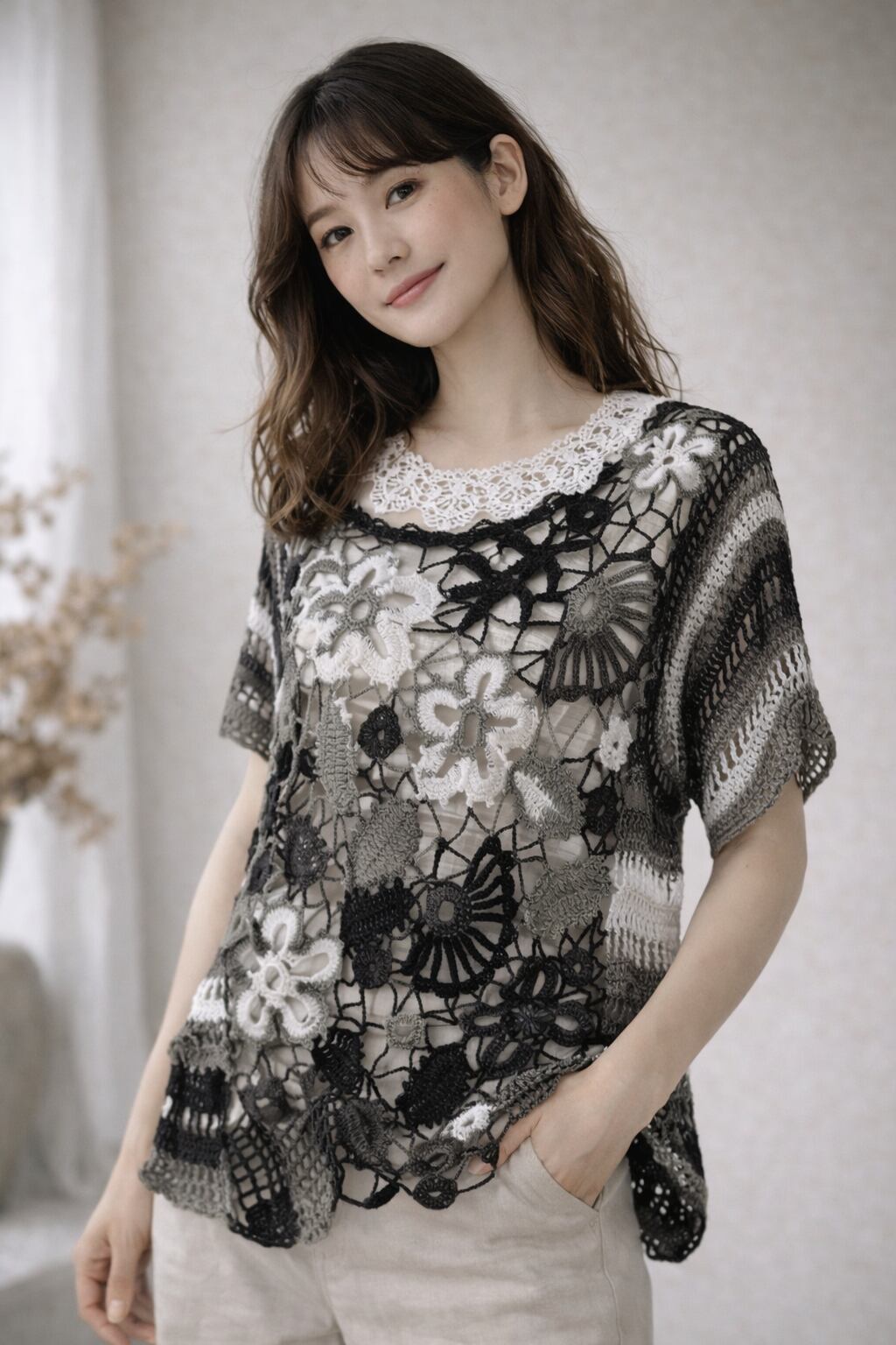 このベストを着ることで、シンプルなお洋服が一気におしゃれに変わります。モノトーンの配色は、落ち着いた雰囲気を演出しつつも、スタイルにアクセントを加えます。